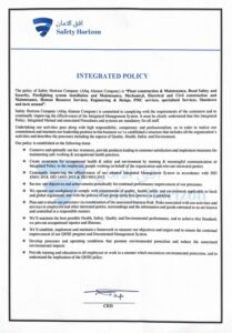 Safety Horizon Company (Afaq Alaman Company) is committed to complying with the requirements of the customers and to continually improving the effectiveness of the Integrated Management System. It must be clearly understood that this Integrated Policy, Integrated Manual and associated Procedures and systems are mandatory for all staff.
